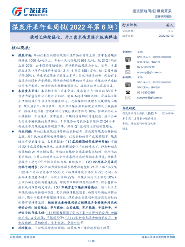 【广发证券】【20220213】20220213-广发证券-煤炭开采行业周报(2022年第6期):稳增长持续强化,开工需求恢复提升板块弹性-16页