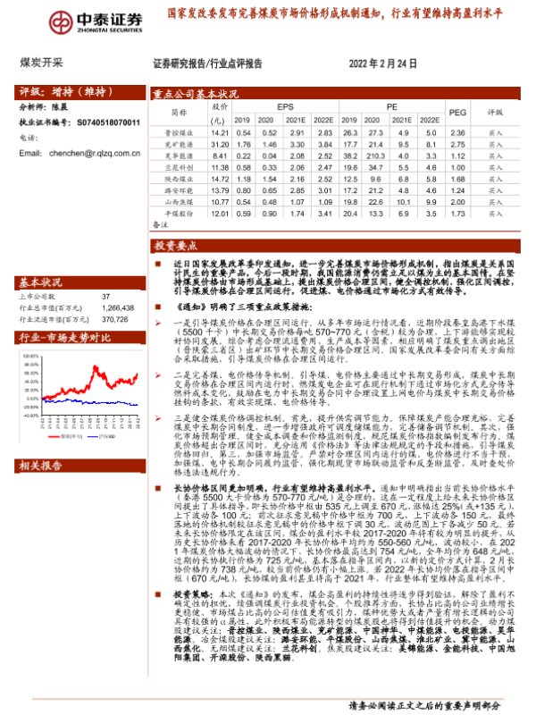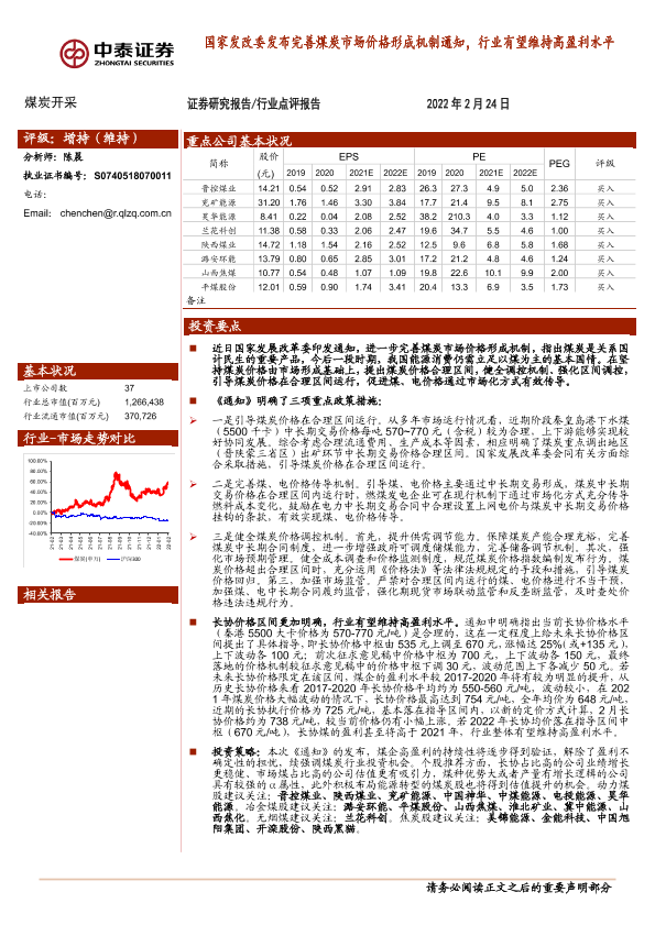 【中泰证券】【20220224】中泰证券-煤炭开采行业点评报告:国家发改委发布完善煤炭市场价格形成机制通知,行业有望维持高盈利水平-3页