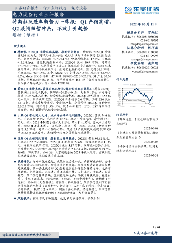 【东吴证券】【20220611】电力设备行业点评报告:特斯拉及造车新势力一季报,Q1产销高增,Q2疫情短暂冲击,不改上升趋势-40页