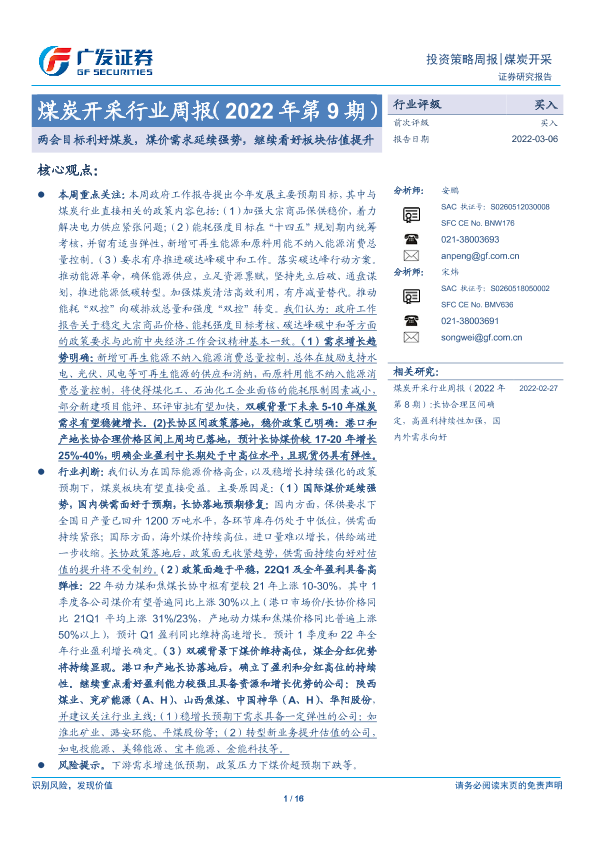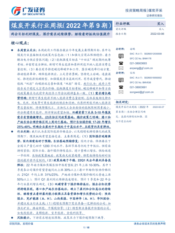 【广发证券】【20220306】20220306-广发证券-煤炭开采行业周报(2022年第9期):两会目标利好煤炭,煤价需求延续强势,继续看好板块估值提升-16页