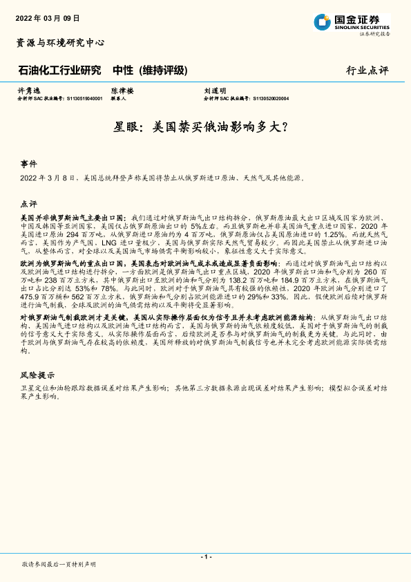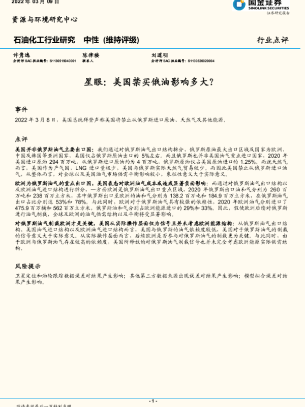 【国金证券】【20220309】国金证券-石油化工行业研究:星眼:美国禁买俄油影响多大?-10页