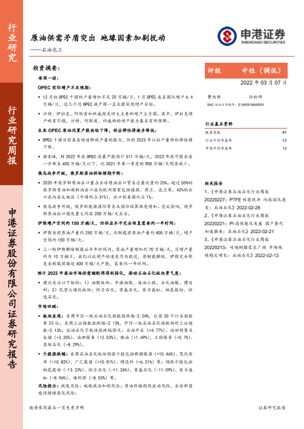 【申港证券】【20220307】20220307-申港证券-石油化工行业研究周报:原油供需矛盾突出 地缘因素加剧扰动-19页