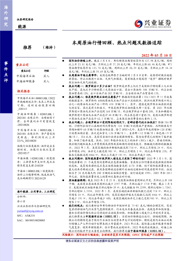 【兴业证券】【20220310】20220310-兴业证券-能源事件点评:本周原油行情回顾、热点问题及数据追踪-12页