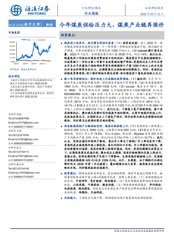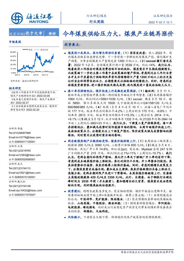 【海通证券】【20220313】20220313-海通证券-煤炭行业周报:今年煤炭供给压力大,煤焦产业链再涨价-2页