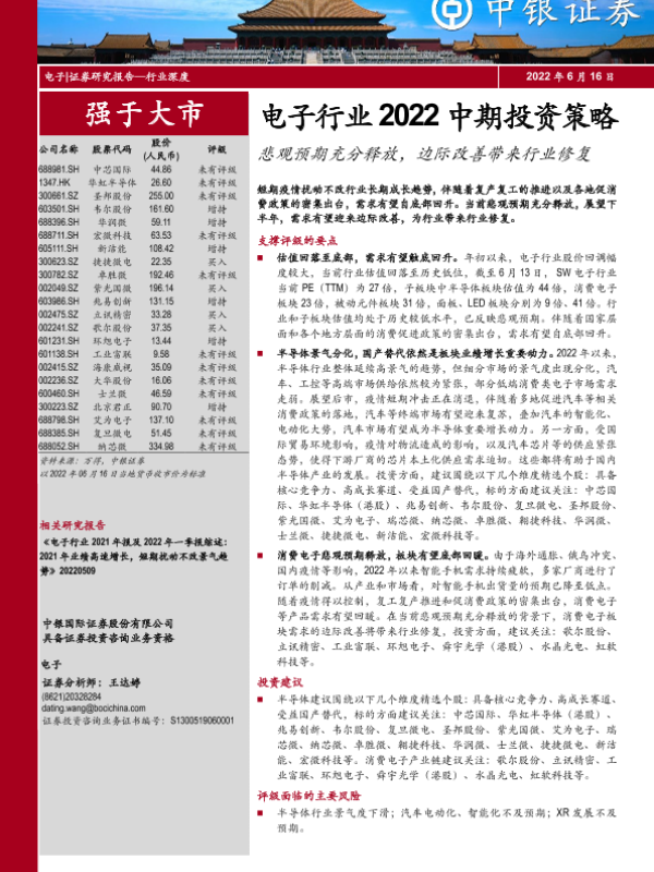 【中银证券】【20220616】电子行业2022中期投资策略:悲观预期充分释放,边际改善带来行业修复-24页