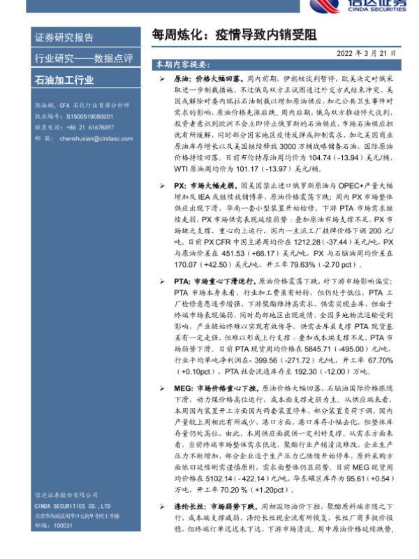 【信达证券】【20220321】每周炼化:疫情导致内销受阻-9页