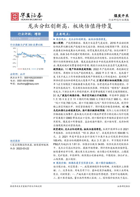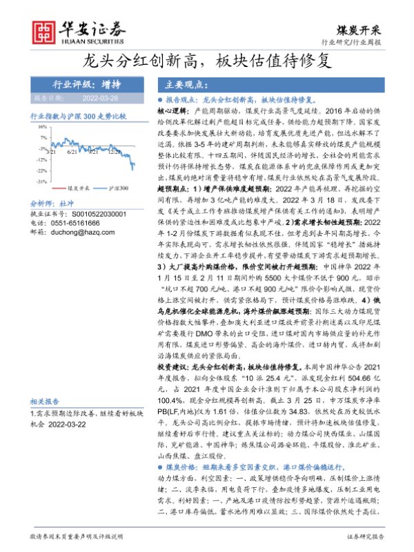 【华安证券】【20220326】20220326-华安证券-煤炭开采行业周报:龙头分红创新高,板块估值待修复-23页