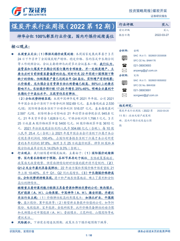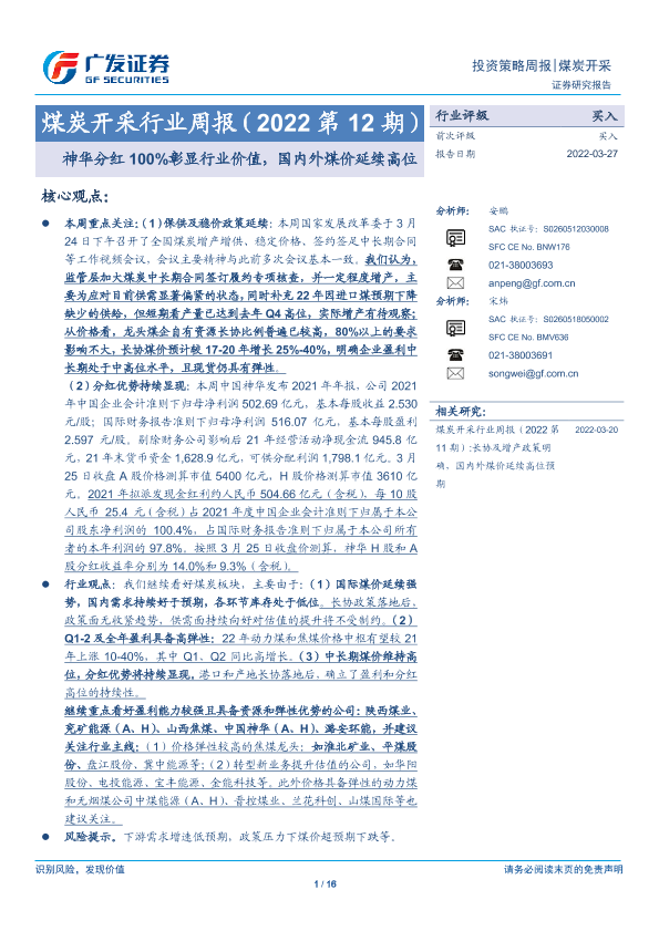 【广发证券】【20220327】20220327-广发证券-煤炭开采行业周报(2022第12期):神华分红100%彰显行业价值,国内外煤价延续高位-16页