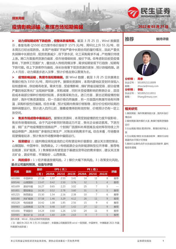 【民生证券】【20220327】煤炭周报:疫情影响运输,焦煤市场短期偏弱-20页