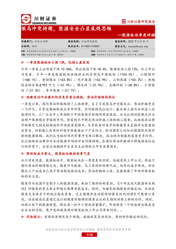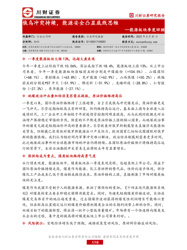 【川财证券】【20220331】20220331-川财证券-能源板块季度回顾:俄乌冲突持续,能源安全凸显底线思维-18页