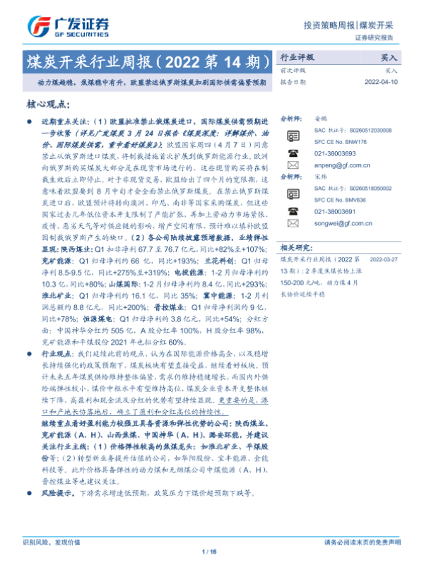 【广发证券】【20220410】20220410-广发证券-煤炭开采行业周报(2022第14期):动力煤趋稳,焦煤稳中有升,欧盟禁运俄罗斯煤炭加剧国际供需偏紧预期-16页