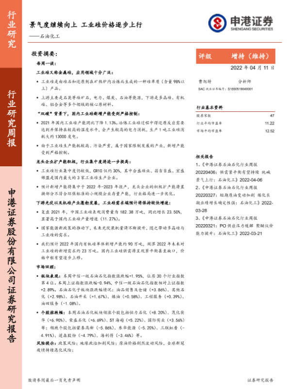 【申港证券】【20220411】20220411-申港证券-石油化工行业研究周报:景气度继续向上 工业硅价格逐步上行-19页