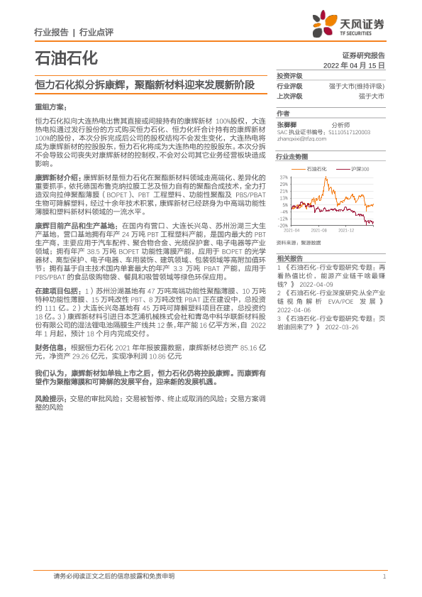 【天风证券】【20220415】石油石化行业点评:恒力石化拟分拆康辉,聚酯新材料迎来发展新阶段-2页
