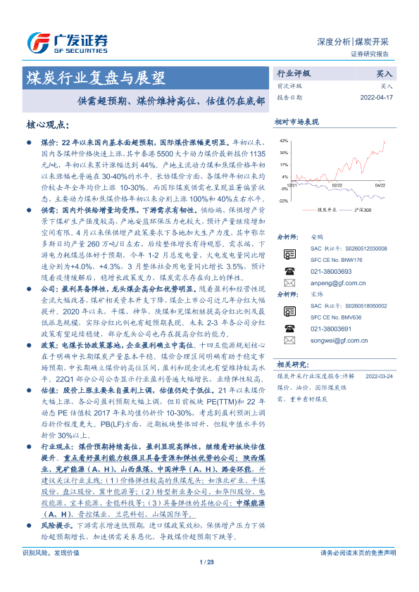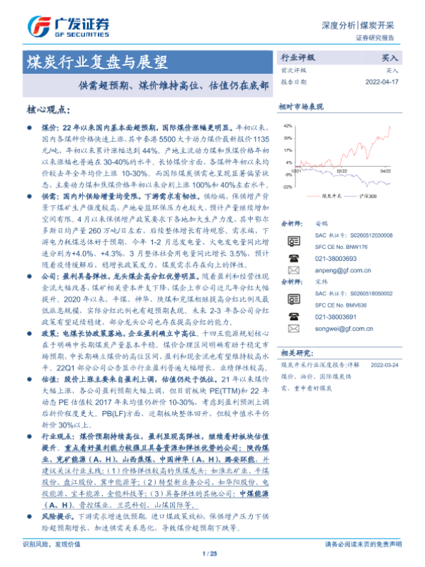 【广发证券】【20220417】煤炭行业复盘与展望:供需超预期、煤价维持高位、估值仍在底部-23页