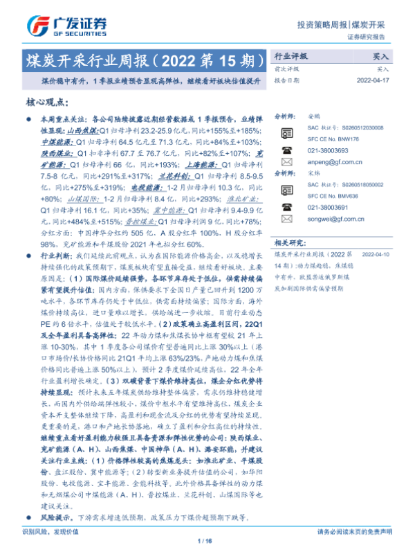 【广发证券】【20220417】煤炭开采行业周报(2022第15期):煤价稳中有升,1季报业绩预告显现高弹性,继续看好板块估值提升-16页