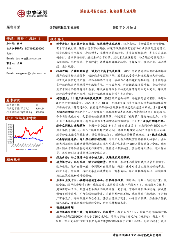 【中泰证券】【20220416】20220416-中泰证券-煤炭开采行业周报:煤企盈利能力强劲,板块强势表现延续-24页