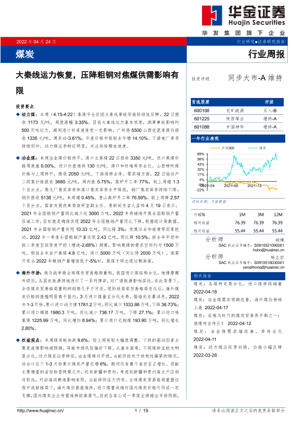 【华金证券】【20220424】20220424-华金证券-煤炭行业周报:大秦线运力恢复,压降粗钢对焦煤供需影响有限-19页