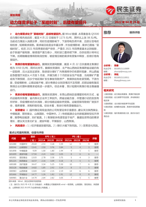 【民生证券】【20220424】20220424-民生证券-煤炭周报:动力煤需求处于“至暗时刻”,后续有望回升-20页