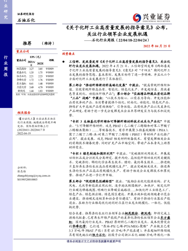 【兴业证券】【20220425】20220425-兴业证券-石化行业周报:《关于化纤工业高质量发展的指导意见》公布,关注行业领军企业发展机遇-16页