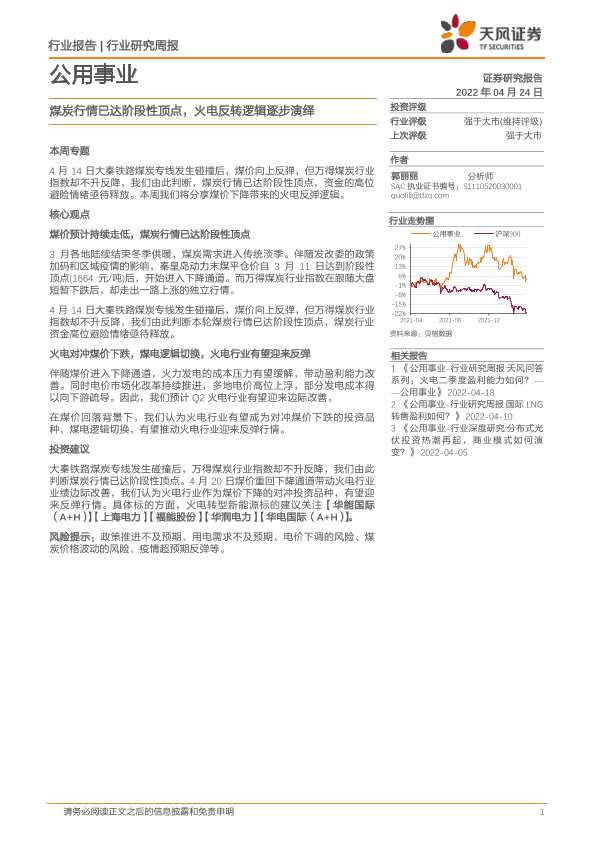 【天风证券】【20220424】公用事业:煤炭行情已达阶段性顶点,火电反转逻辑逐步演绎-14页