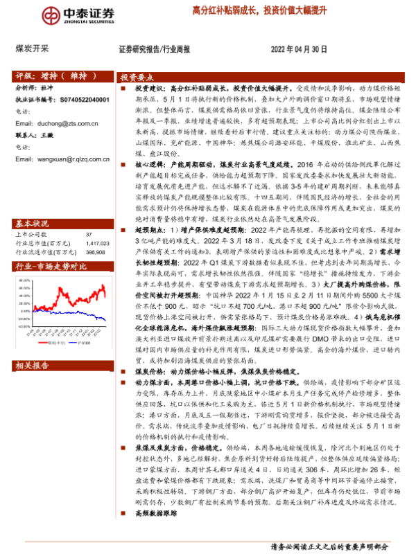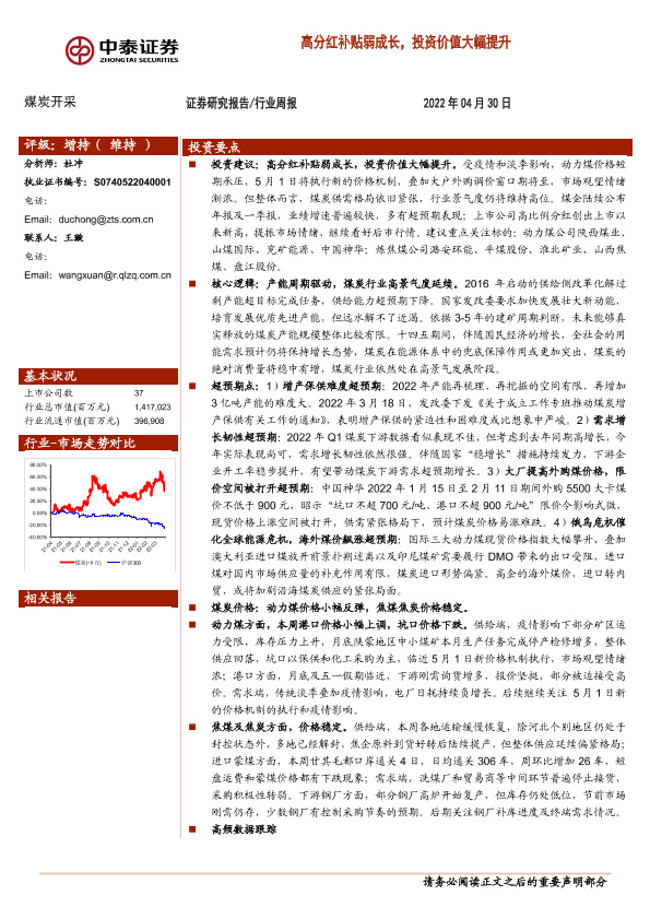 【中泰证券】【20220430】20220430-中泰证券-煤炭开采行业周报:高分红补贴弱成长,投资价值大幅提升-24页