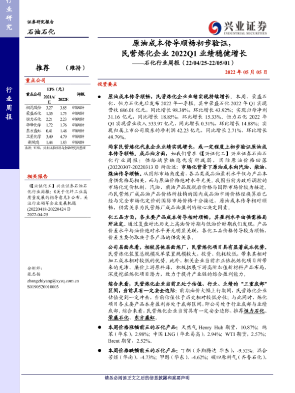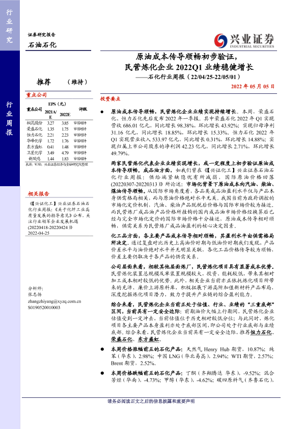 【兴业证券】【20220505】20220505-兴业证券-石化行业周报:原油成本传导顺畅初步验证,民营炼化企业2022Q1业绩稳健增长-16页