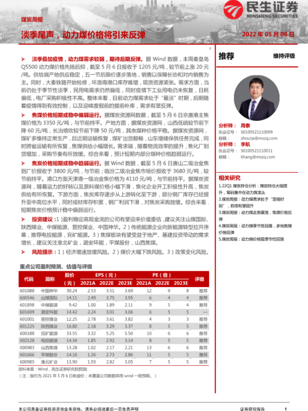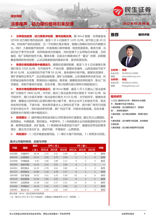 【民生证券】【20220508】煤炭周报:淡季尾声,动力煤价格将引来反弹-17页
