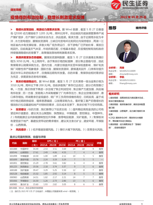 【民生证券】【20220529】20220529-民生证券-煤炭周报:疫情得到有效控制,稳增长刺激需求反弹-19页