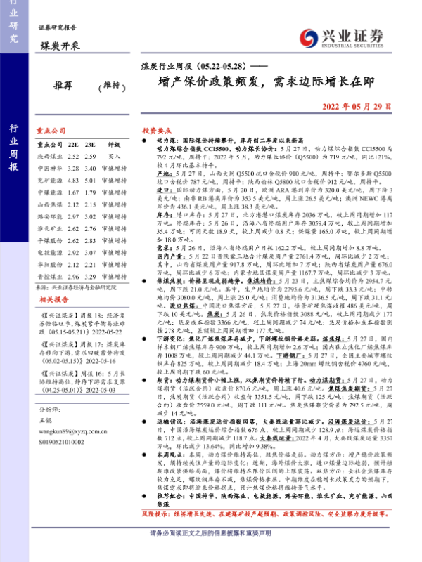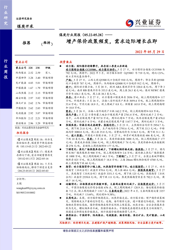 【兴业证券】【20220529】煤炭行业周报(05.22-05.28)——增产保价政策频发,需求边际增长在即-12页