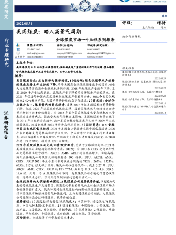 【国泰君安证券】【20220531】美国煤炭:踏入高景气周期-19页