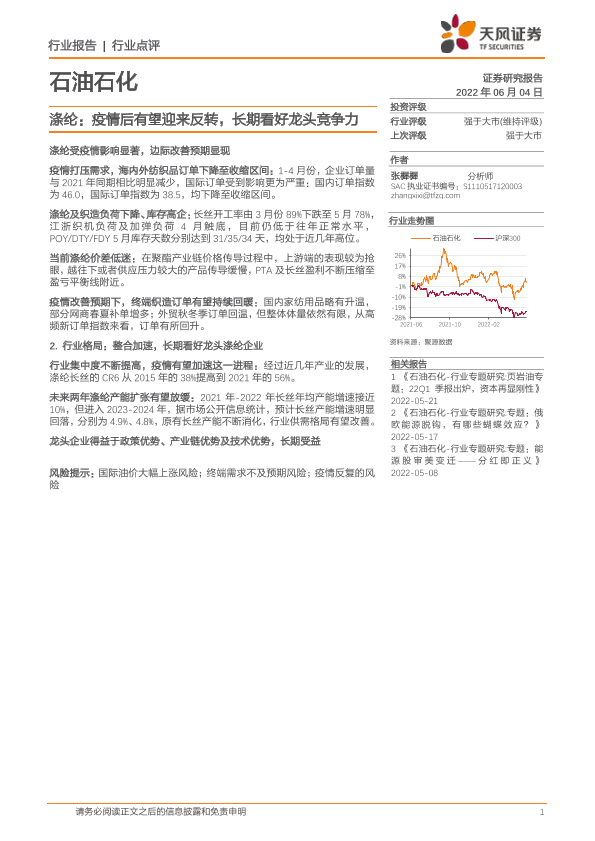 【天风证券】【20220604】石油石化行业点评:涤纶:疫情后有望迎来反转,长期看好龙头竞争力-7页