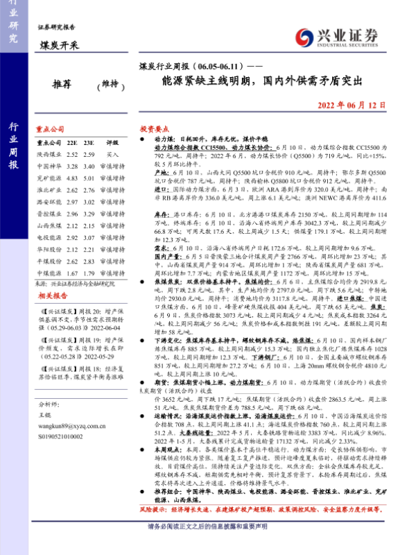 【兴业证券】【20220612】煤炭行业周报(06.05-06.11)——能源紧缺主线明朗,国内外供需矛盾突出-12页