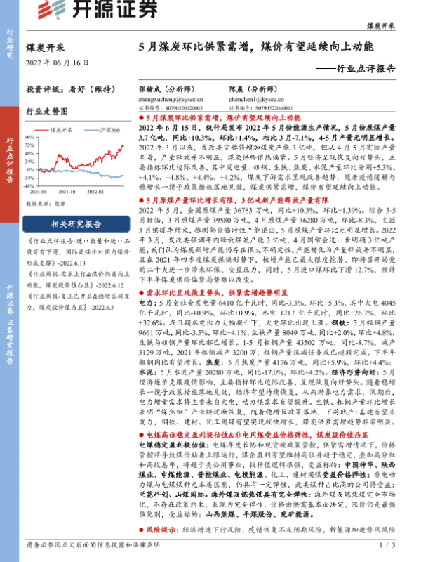 【开源证券】【20220616】20220616-开源证券-煤炭开采行业点评报告:5月煤炭环比供紧需增,煤价有望延续向上动能-3页