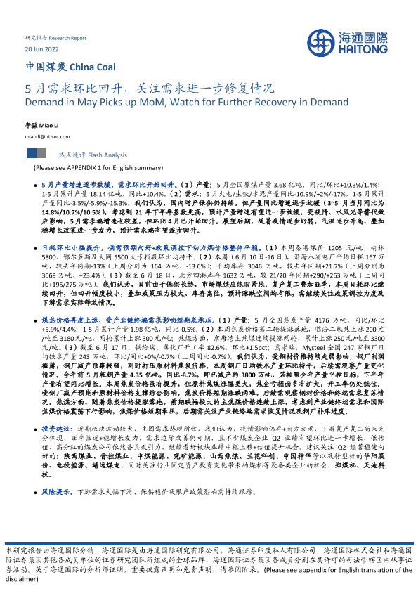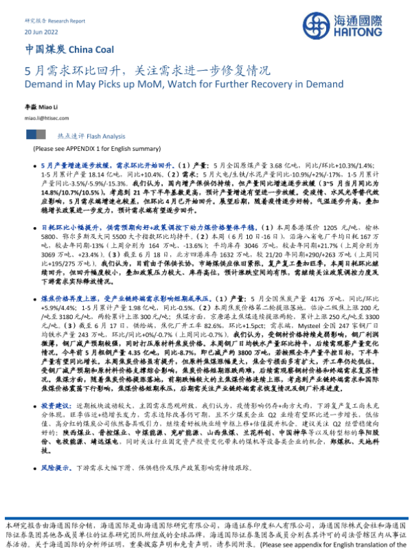 【海通国际】【20220620】中国煤炭:5月需求环比回升,关注需求进一步修复情况-9页