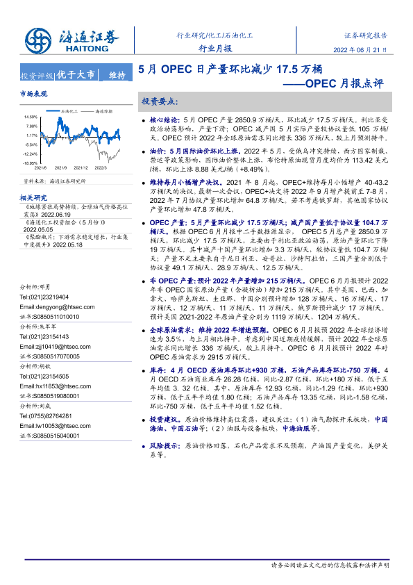 【海通证券】【20220621】20220621-海通证券-石油化工行业OPEC月报点评:5月OPEC日产量环比减少17.5万桶-5页