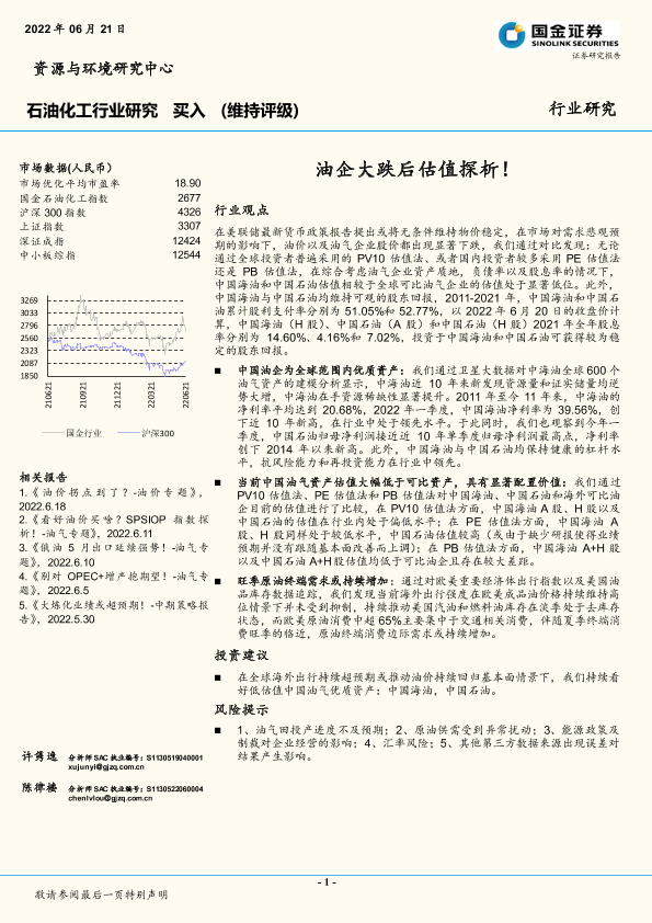 【国金证券】【20220621】20220621-国金证券-石油化工行业研究:油企大跌后估值探析!-17页