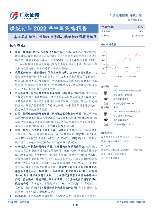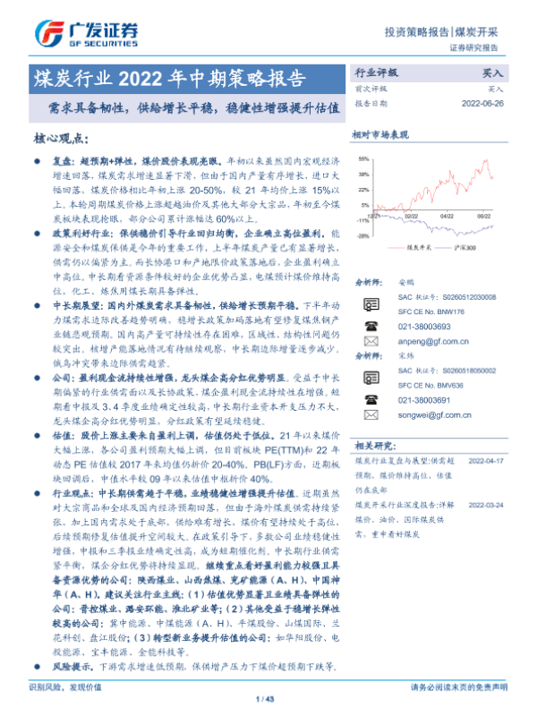 【广发证券】【20220626】煤炭行业2022年中期策略报告:需求具备韧性,供给增长平稳,稳健性增强提升估值-43页