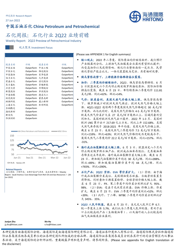 【海通国际】【20220627】石化周报:石化行业2Q22业绩前瞻-12页