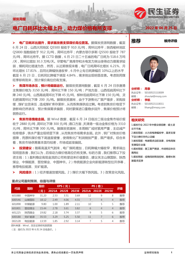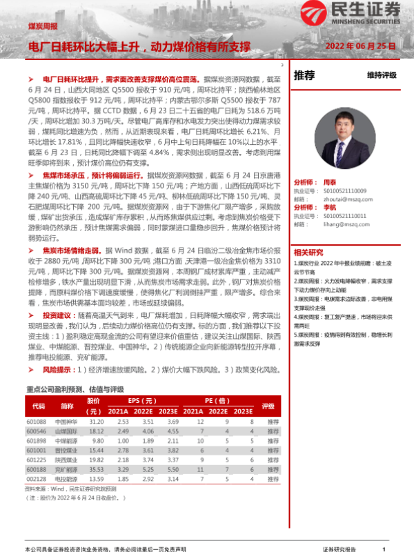 【民生证券】【20220625】20220625-民生证券-煤炭周报:电厂日耗环比大幅上升,动力煤价格有所支撑-21页