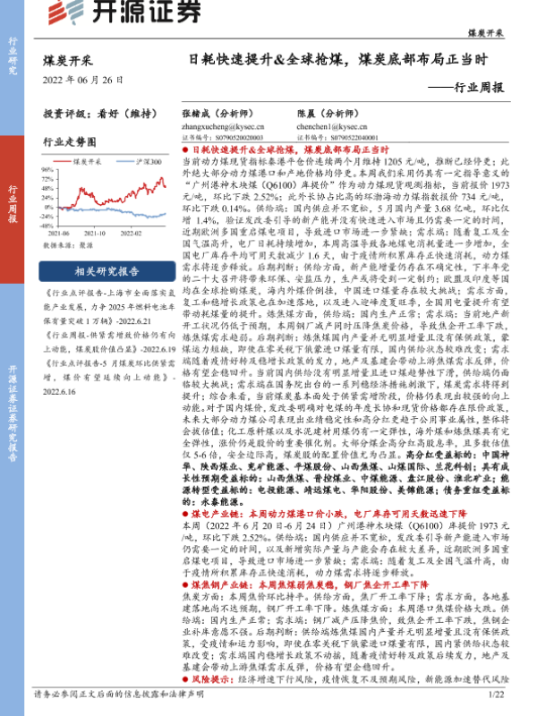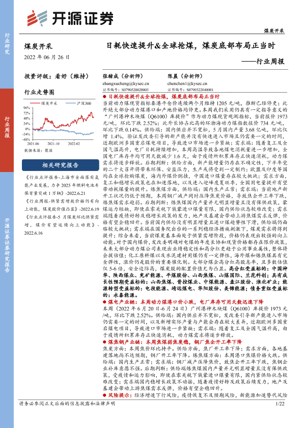 【开源证券】【20220626】20220626-开源证券-煤炭开采行业周报:日耗快速提升&全球抢煤,煤炭底部布局正当时-22页