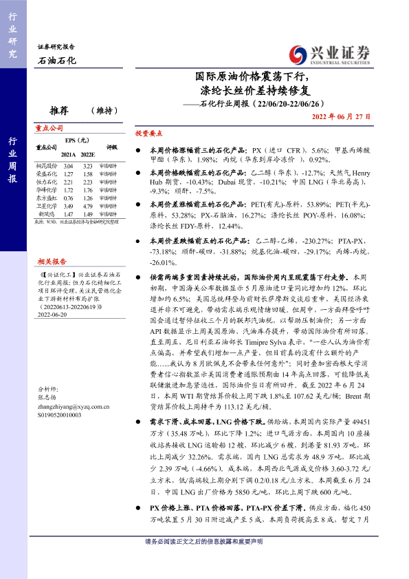【兴业证券】【20220627】20220627-兴业证券-石化行业周报:国际原油价格震荡下行,涤纶长丝价差持续修复-16页