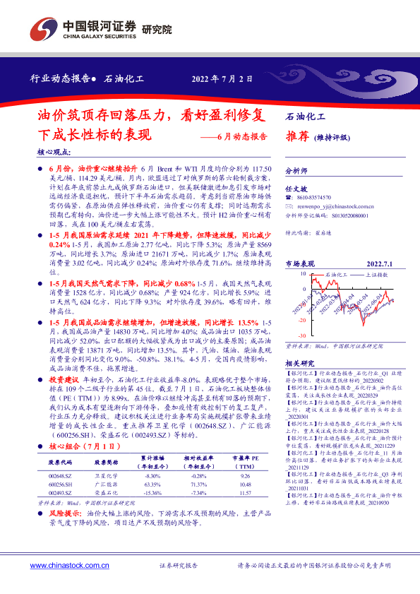 【银河证券】【20220702】20220702-中国银河-石油化工6月动态报告:油价筑顶存回落压力,看好盈利修复下成长性标的表现-24页