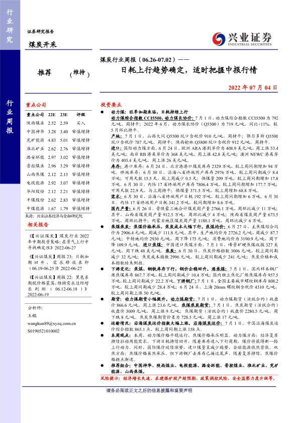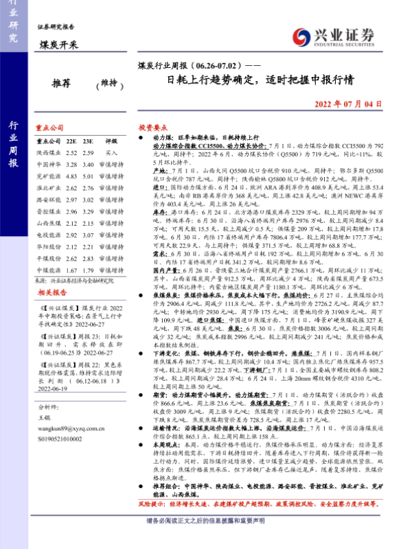 【兴业证券】【20220704】煤炭行业周报(06.26-07.02)——日耗上行趋势确定,适时把握中报行情-13页
