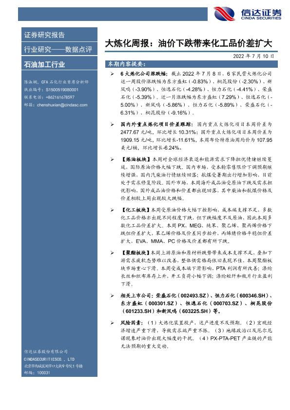 【信达证券】【20220710】大炼化周报:油价下跌带来化工品价差扩大-18页