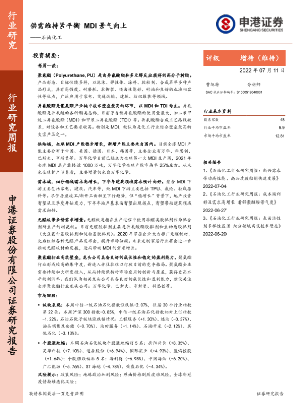 【申港证券】【20220711】20220711-申港证券-石油化工行业研究周报:供需维持紧平衡MDI景气向上-19页