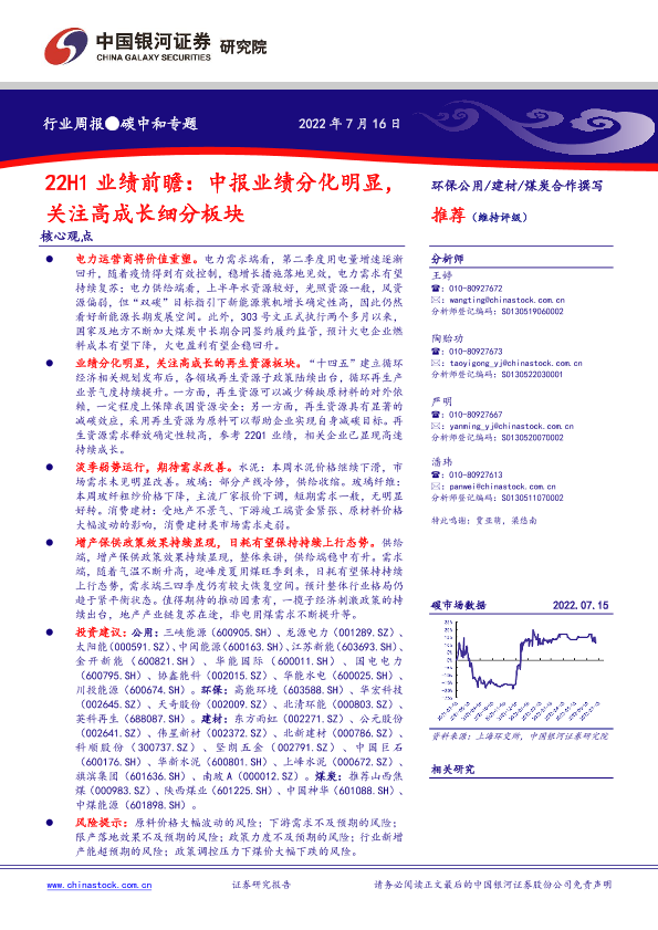 【银河证券】【20220716】20220716-中国银河-环保公用 建材 煤炭行业周报:22H1业绩前瞻:中报业绩分化明显,关注高成长细分板块-27页