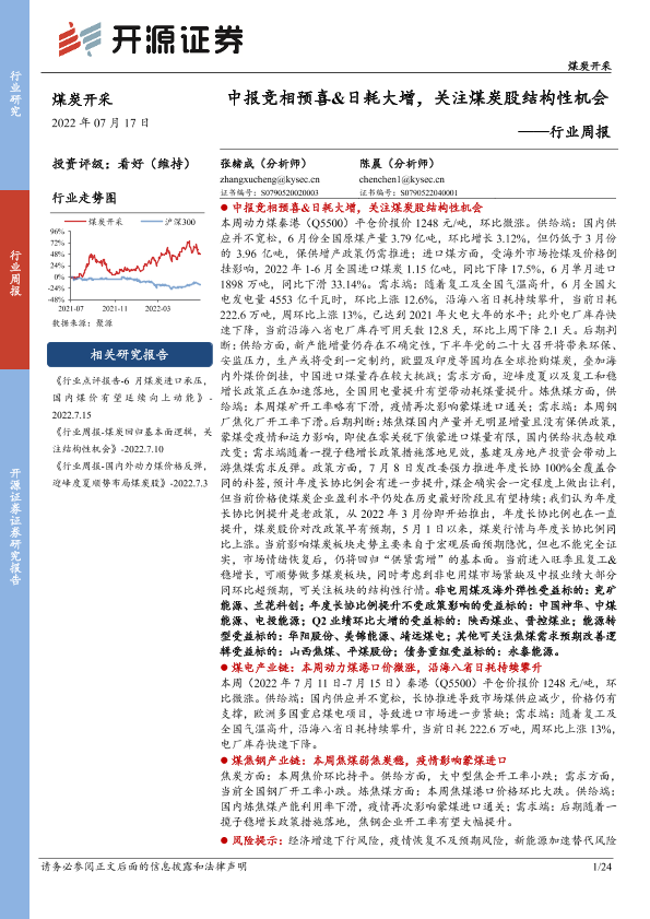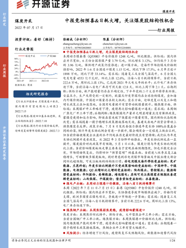 【开源证券】【20220717】20220717-开源证券-煤炭开采行业周报:中报竞相预喜&日耗大增,关注煤炭股结构性机会-24页