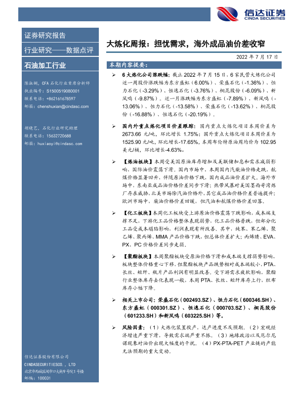 【信达证券】【20220717】大炼化周报:担忧需求,海外成品油价差收窄-18页