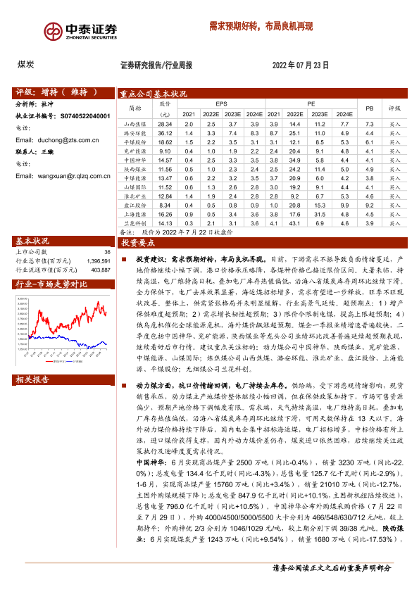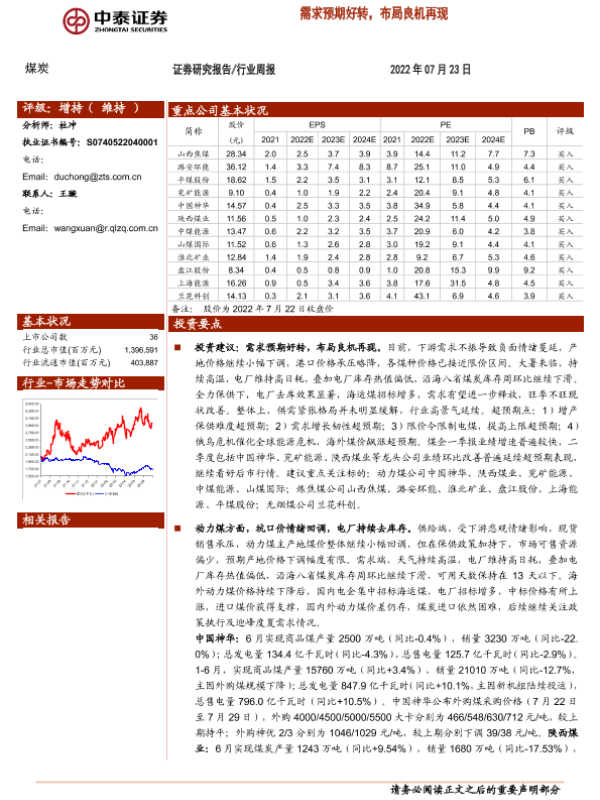 【中泰证券】【20220723】20220723-中泰证券-煤炭行业周报:需求预期好转,布局良机再现-24页