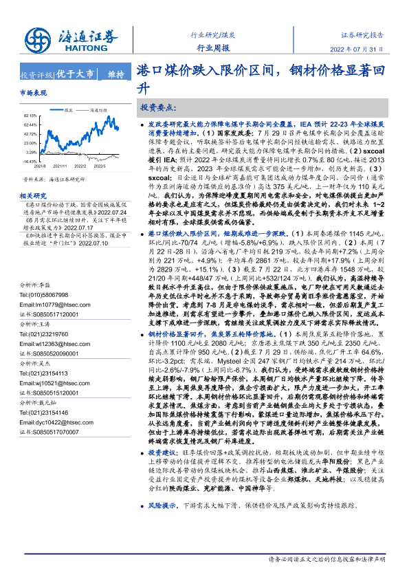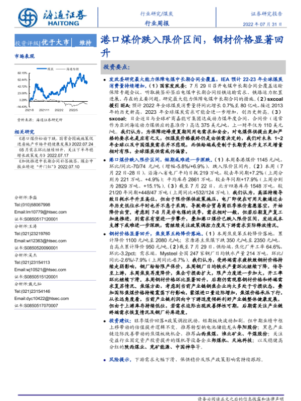 【海通证券】【20220731】20220731-海通证券-煤炭行业周报:港口煤价跌入限价区间,钢材价格显著回升-2页